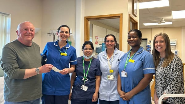 Our picture shows Charity Steward Tony Bevan presenting a cheque for £1,000 to SACT Sister Anna Cook at the Cancer Care and Haematology Unit, Stoke Mandeville Hospital, and some of the clinical staff (left to right): Remya Ushakumari, Hannah Evett and Liza Nketiah, earlier this year. Also in the picture is Tony's daughter-in-law, Kate Miles, who continues to receive treatment at CCHU and who has herself raised many thousands of pounds for cancer charity.