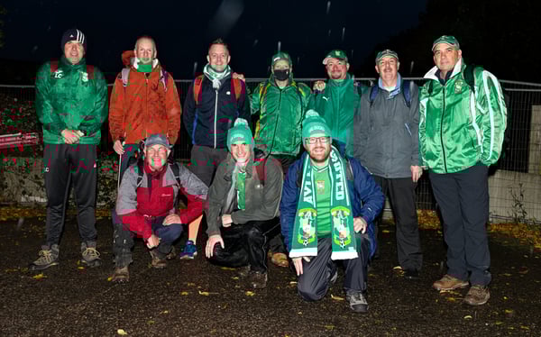 Our picture shows the walkers at the former Buckingham Road stadium in the early morning rain before they set off.