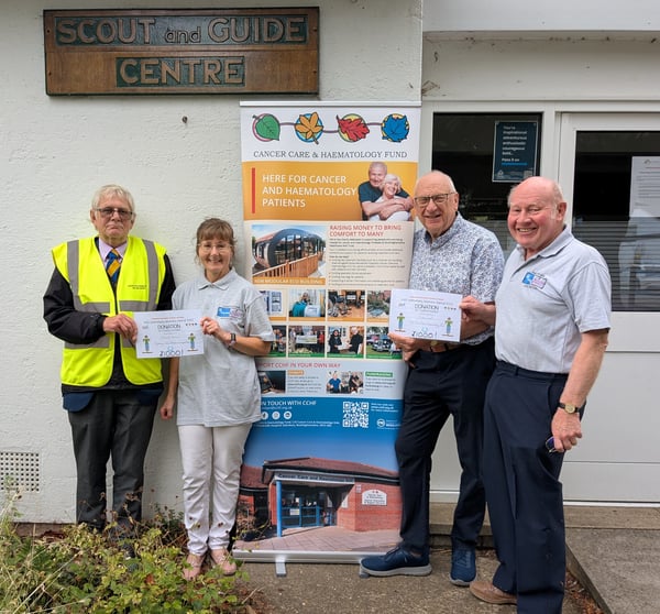 Our main picture shows Francesca Flaxton and Richard Kendall from Haddenham Scout and Guide Association, with Mike Snell of the Cancer Care and Haematology Fund (second from right) and Richard Veness of Aylesbury Vale Prostate Cancer Support Group (far left).